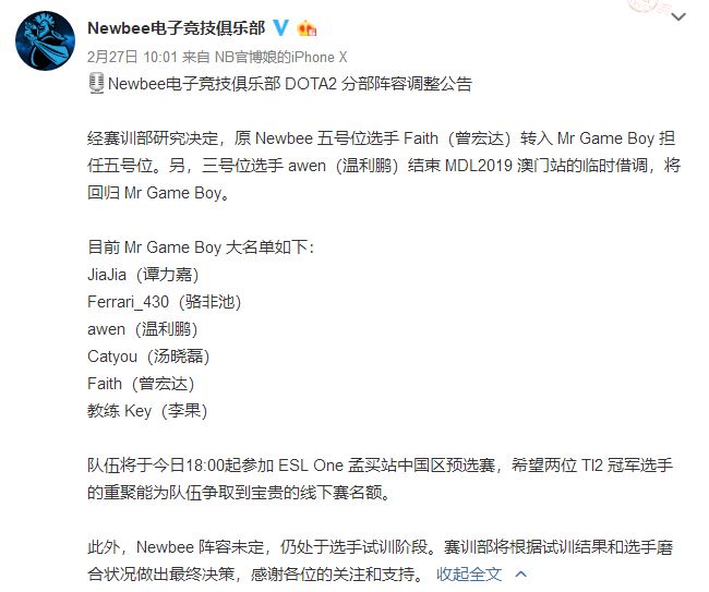 1.今天,NB发布公告,宣布队伍五号位小明转入MGB,这样MGB就有两个TI冠军了,TI2冠军小明和430。