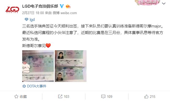 2.LGD的官博透露选手的瑞典签证顺利出签,其中有XM,不出意外的话,MAYBE是鸽了本次MAJOR了。