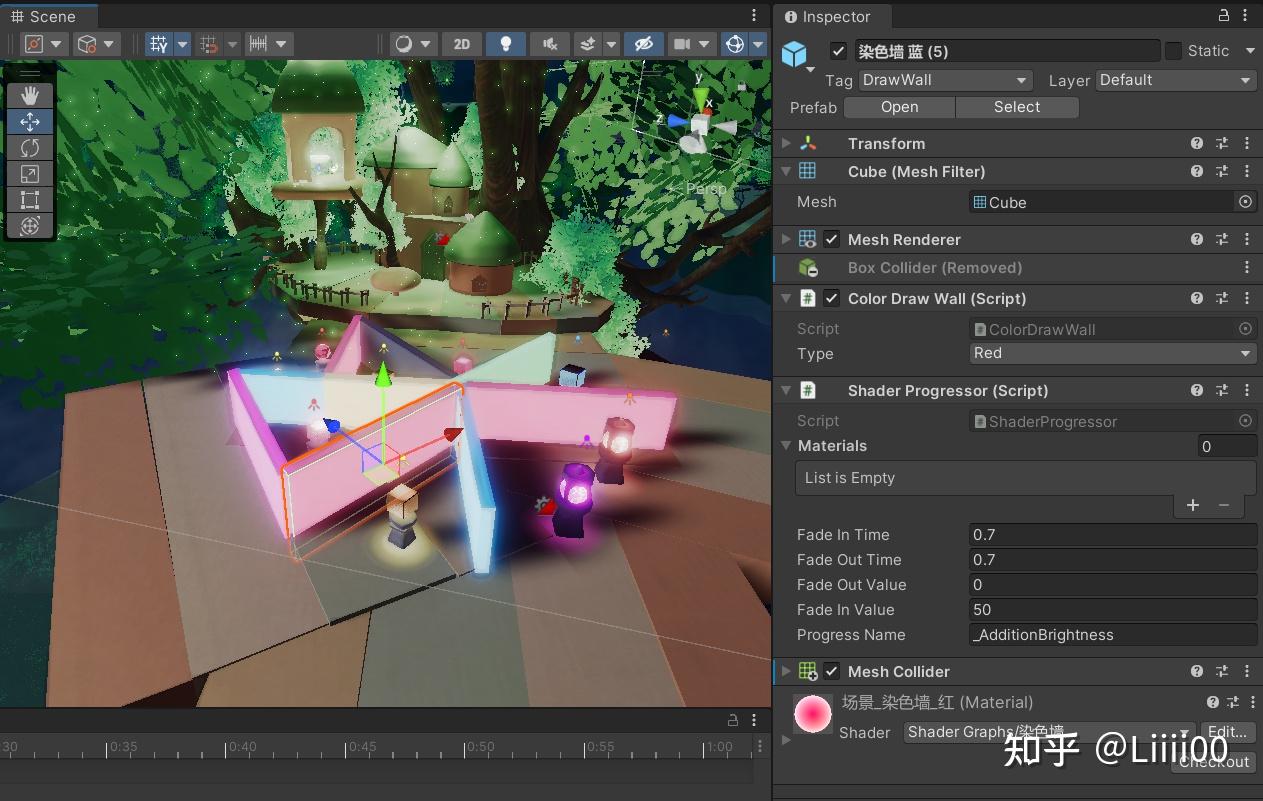 比如这一个染色墙,挂载了一个染色的功能,有一个当前颜色的参数,还有一个Shader Progressor组件用以产生反馈。是不是就比之前的简洁多了?
