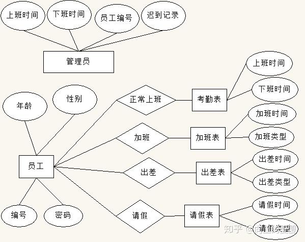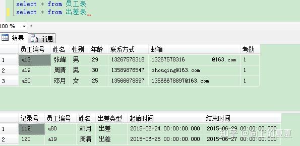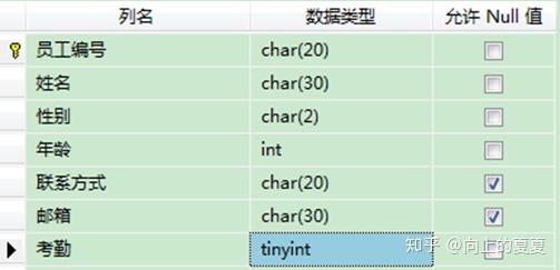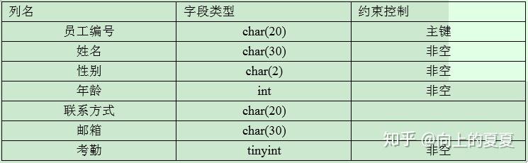 员工表(员工编号,姓名,性别,年龄,联系方式,邮箱,考勤)