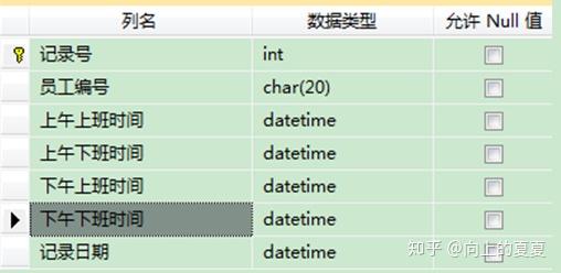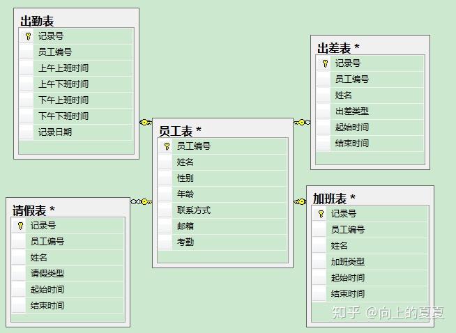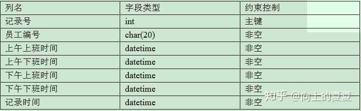 出勤表(记录号,员工编号,上午上班时间,上午下班时间,下午上班时间,下午下班时间,记录时间)