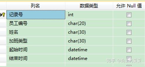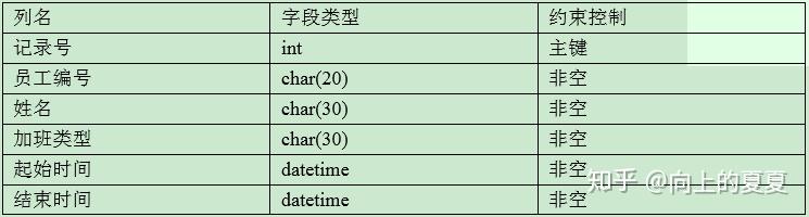 (5)加班表包含记录号,员工编号,姓名,加班类型,起始时间,结束时间。
