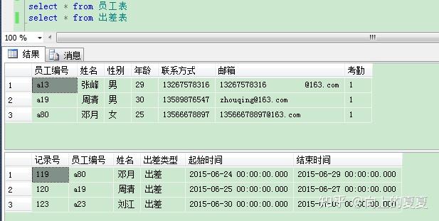 (1) 创建一个触发器,当删除员工基本信息时,时也删除其他表中员工的信息。如当删除员工表中信息时,也删除出差表中的内容,出勤表,加班表,请假表分别建立此类触发器。