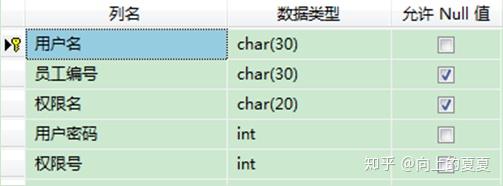 用户表(用户名,员工编号,权限名,用户密码,权限号)