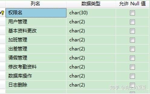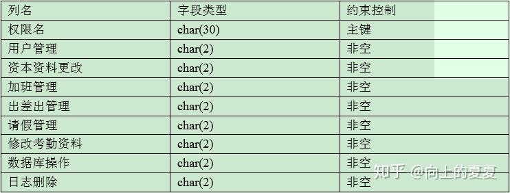 权限表(权限名,用户管理,资本资料更改,加班管理,出差出管理,请假管理,修改考勤资料,数据库操作,日志删除)