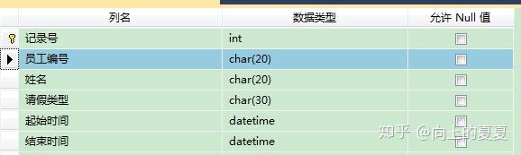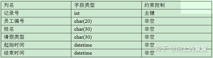 (7)请假表包含记录号,员工编号,姓名,请假类型,起始时间,结束时间。