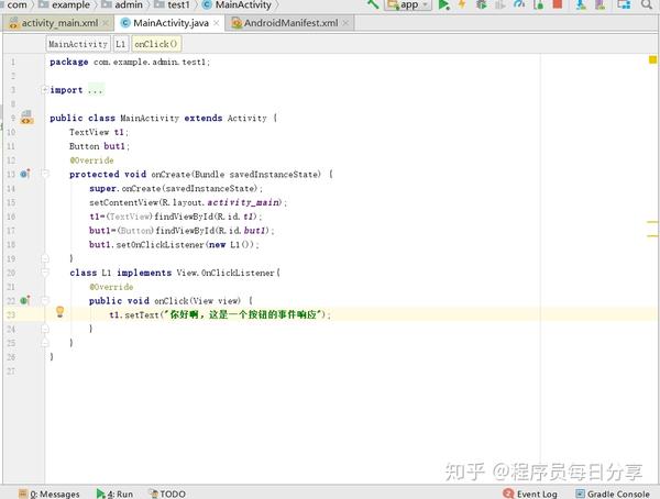 (2)在MainActivity里进行业务逻辑处理:定义两个组件的全局变量,然后通过find ViewById,获取R文件两个组件的id号,进行业务处理,给Button设置一个事件响应。通过实现View类的OnClickListener接口,以及public void onClick(View v){