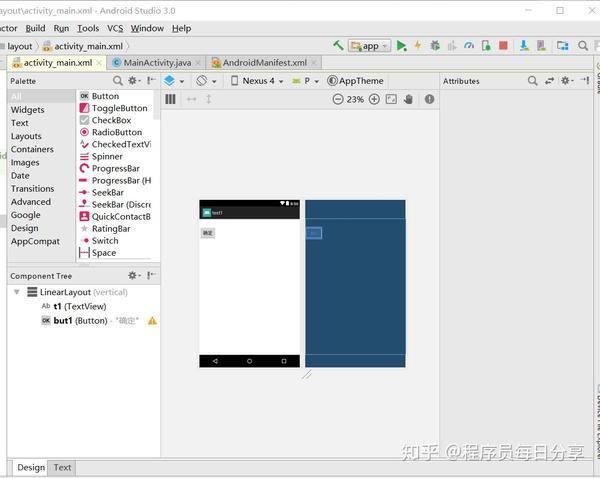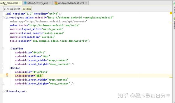 可以通过desion进行设计,可以看到效果,我们设置了两个组件,并为每一个组件设置了id,文本框的id为t1,按钮的id为but1,这个id好任意命名,是为了方便MainActivity进行调用。