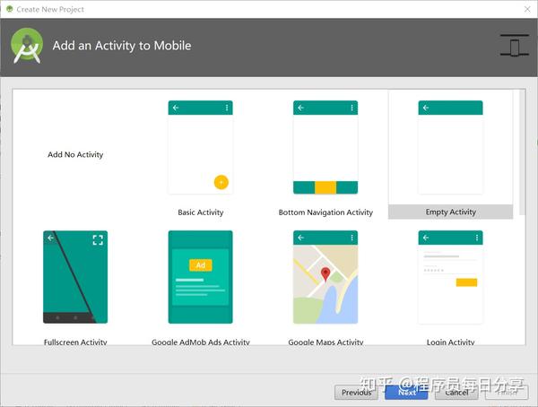 4.选择Android 的模板,选择基础类android 的空模板Empty Activity,点后点击Next