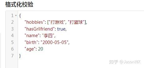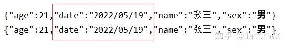 String jsonStr = "{\"name\":\"张三\",\"age\":22,\"hobbies\":[\"看电影\",\"敲代码\"],\"birth\":\"2000-05-05\"}";