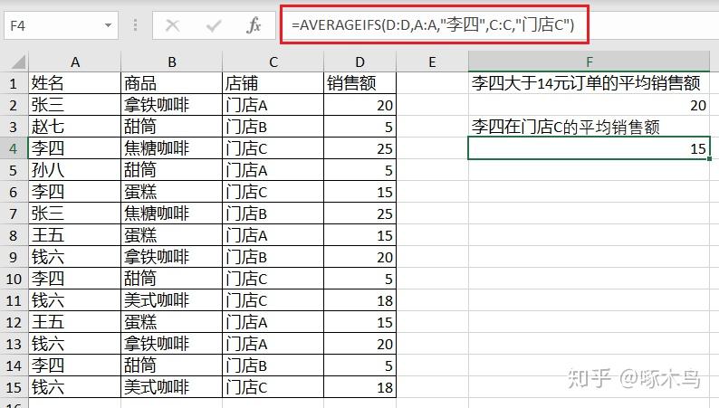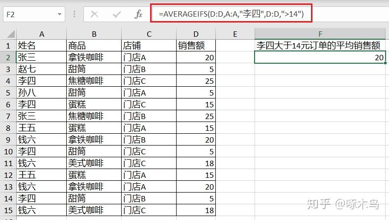 假如我们统计条件更加复杂一些,统计李四大于14元订单的平均销售额,这时筛选的条件有两个,第一个是姓名为李四,第二个是大于14元的订单,这时我们就需要使用AVERAGEIFS函数,语法规则是: