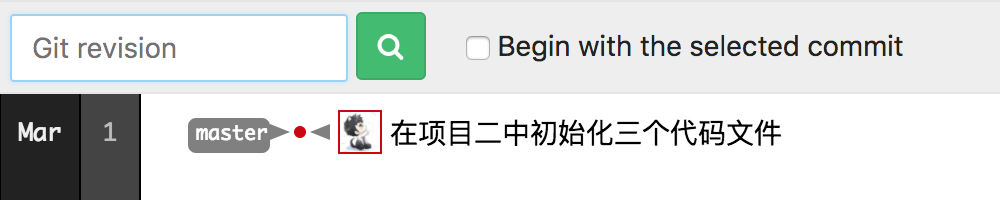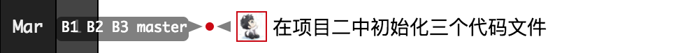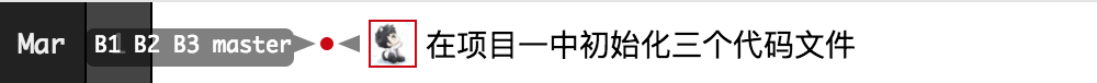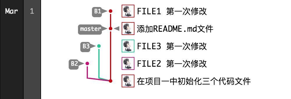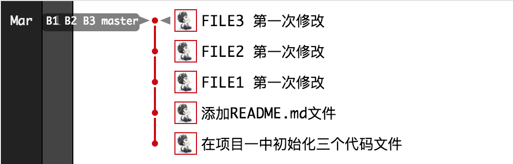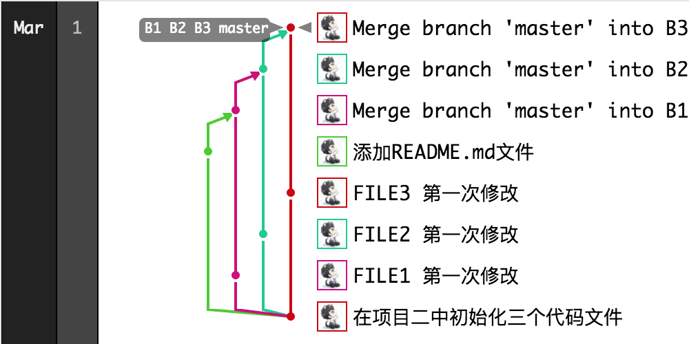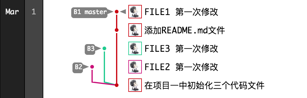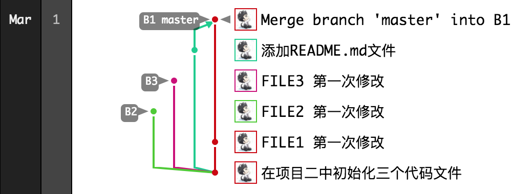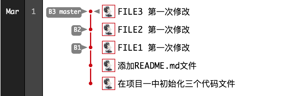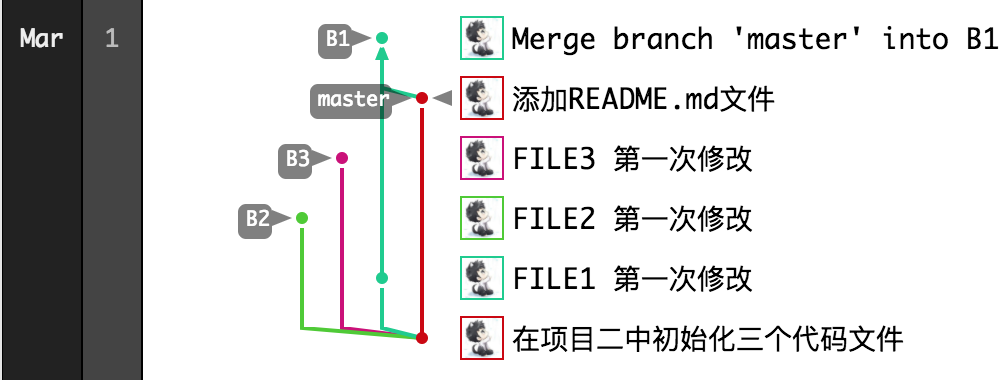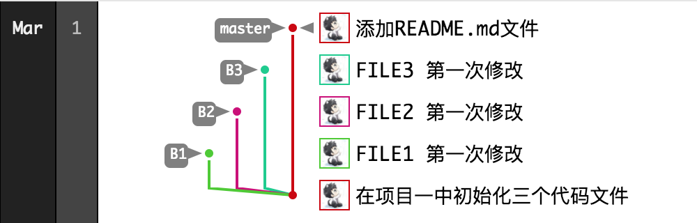 三、现在我们分别切换分支到 B1,B2,B3,并修改对应的文件 file1,file2,file3,最后切换到 mastet 分支添加一个 README.md 文件,然后再看时间轴: