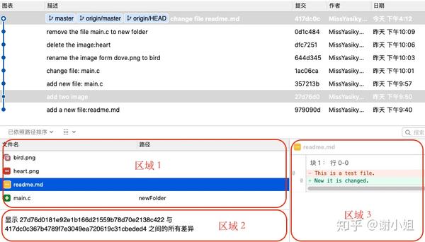 如果我们想比对两个 commit 之间的差异,可以同时选中两个 commit,这时在提交图表的下方就可以看到两个 commit 的差异比对了,如上图所示。上图的区域 2 给出了摘要信息,告诉用户展示的内容是“xxxx与xxxx之间的所有差异”(xxxx分别表示两个 commit 的 hash 值),区域 1 展示了被改动的文件列表,区域 3 则展示了左边选中的文件的改动内容。上图区域 1 每一行前面有个 icon,第一个紫色的 icon 表示“移动/重命名”,第二个红色的 icon 表示“删除”,第三个黄色的表示“修改”,第四个绿色的表示“新增”,这四种代表了 Git 中最常出现的四种操作。后缀为 .png 的文件为二进制文件,.c 跟 .md 的文件为文本文件,文本文件的修改可以在右侧区域 3 看到具体的修改内容,标红的内容表示该行从 a 版本删除(此处 a 版本指 commit 27d76d0),标绿的表示在 b 版本(此处 b 版本指commit 417dc0c)新增的内容。注意,此时的差异不包括 a 版本那个 commit 所进行的修改。