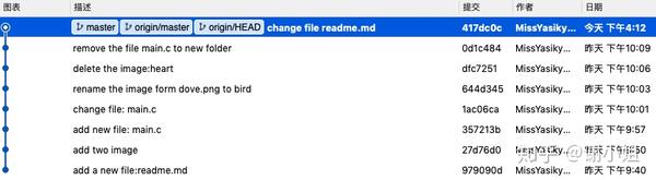 这样一来,文件夹 DiffTest 下的所有文件的增删改重命名等各种变更操作都会被纳入版本管理中。接下来我在路径下陆续新增文本文件 readme.md、main.c,二进制文件 heart.png、dove.png,并分多次提交。然后对该路径下的文件进行移动、删除、重命名、内容修改等操作,也分多次提交。提交记录如以下 SourceTree 截图所示:
