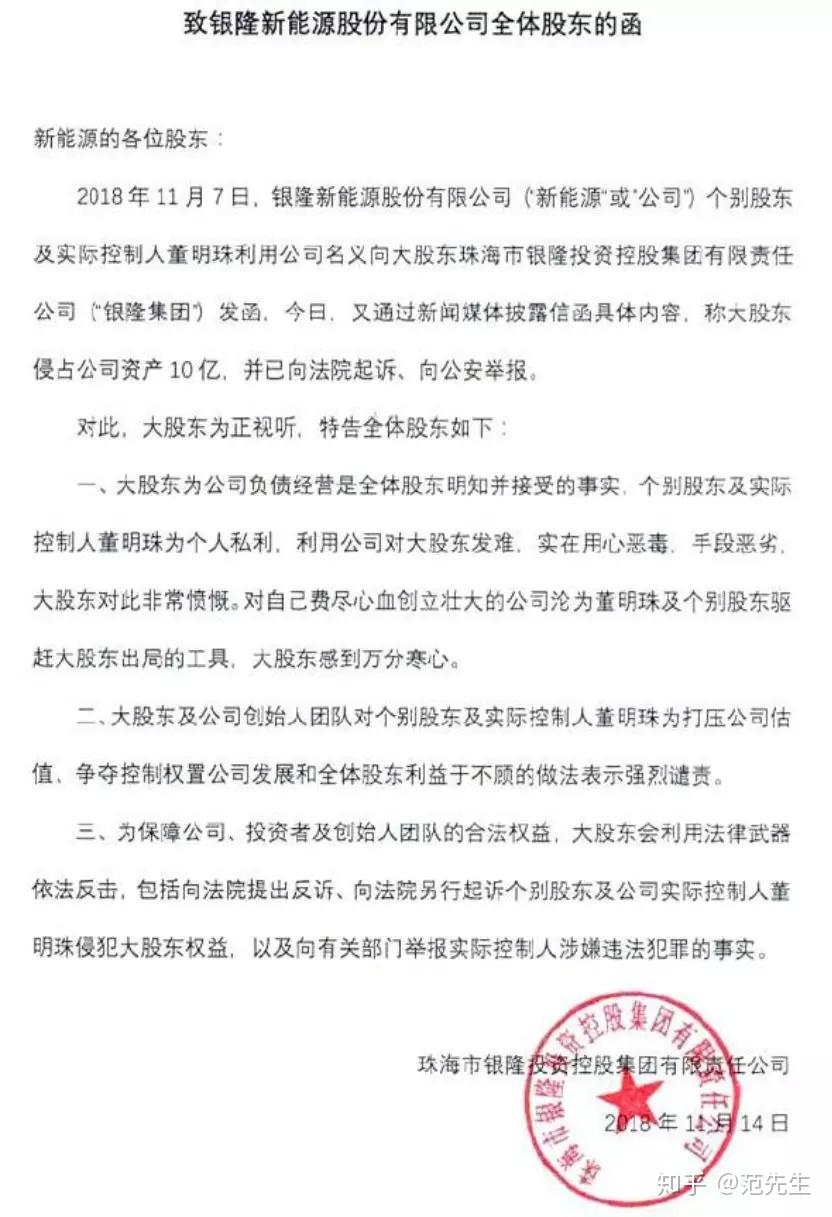 2018年11月13日,银隆新能源股份有限公司发布《致银隆新能源股份有限公司各股东的函》,控诉原董事长魏银仓、原总裁孙国华侵占公司利益高达10亿,已经向珠海当地报案,目前魏银仓滞留香港超过3个月; 而颇为戏剧性的是,魏银仓反倒打回马枪,起诉董明珠, 同时指责董明珠用心狠毒,手段恶劣,试图打压公司估值赶自己出局,并声称会举报董明珠违法犯罪事实,上演了一出局中局。至此, 魏银仓与董明珠已完全撕破脸皮。