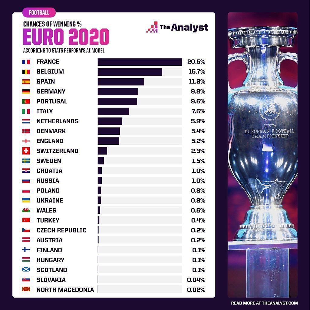 2020年欧洲杯前瞻,法葡是绝对夺冠热门。