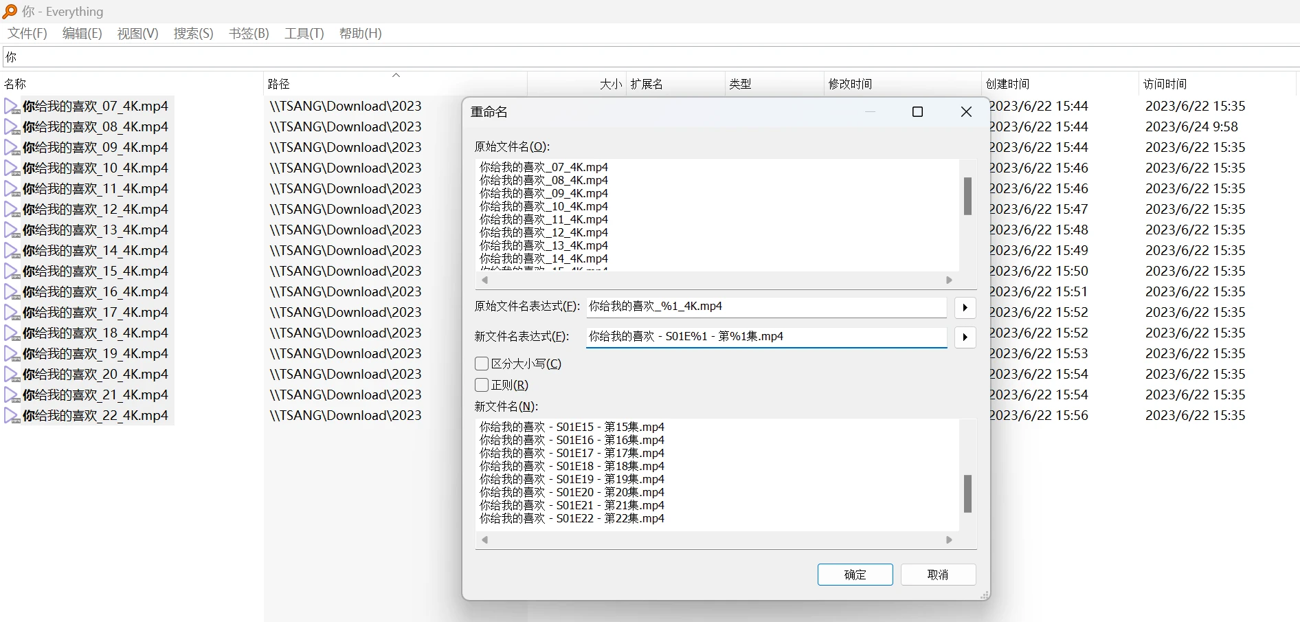 四、 软件已经对本地所有都扫描了的,如果不搜索关键字,慢慢去翻查,估计能够干累趴下。这里‘你’关键字搜索,出现了第7~22集的出现,前面6集没包含‘你’关键字,所有不显示出来。全部选择,右键-重命名。