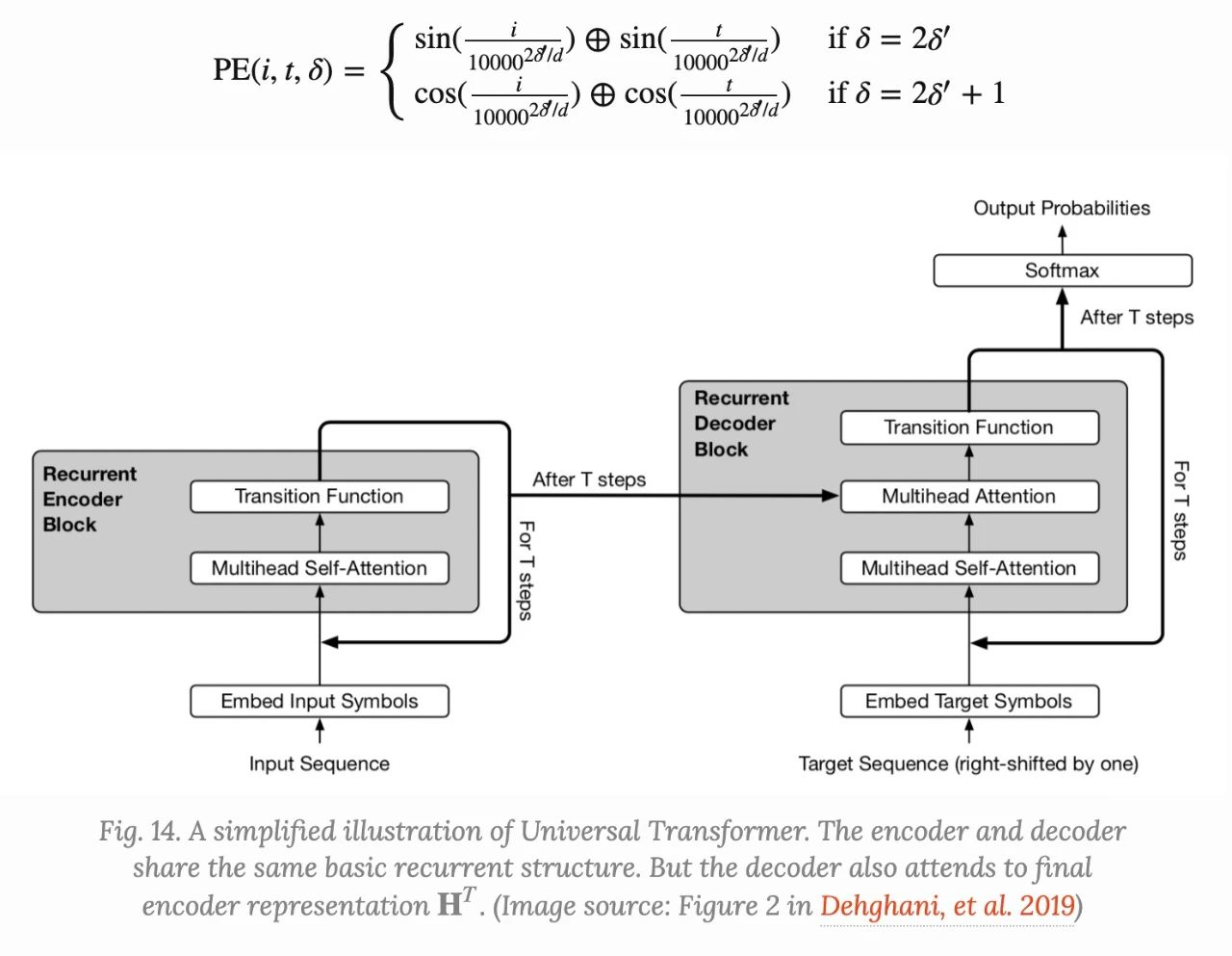 给定长度为 L 的序列,Universal Transformer在第步迭代更新表示 H^{t}\in R^{L*d} ,在第0步, H^{0} 被出事为输入embedding矩阵,所以的位置编码在multi-head self-attenion中被并行处理,然后在经过一个recurrent transition function A_{t} = LayerNorm(H^{t-1} + MultiHeadAtt(H^{t-1} + P^{t})H^{t} = LayerNorm(A^{t-1} + Transition(A^{t})))