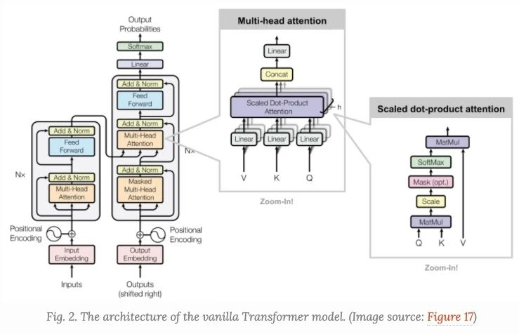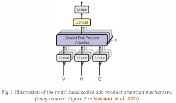 multi-head self-attention是Transformer的核心组成部分,和简单的attention不同之处在于,Multihead机制将输入拆分为许多小的chunks,然后并行计算每个子空间的scaled dot product,最后我们将所有的attention输出进行拼接, MultiheadAttention(X_{q}, X_{k}, X_{v}) = [head_{1},...,head_{h}]W^{o}head_{i} = Attention(X_{q}W^{q}_{i}, X_{k}W_{i}^{k}, X_{v}W_{i}^{v})