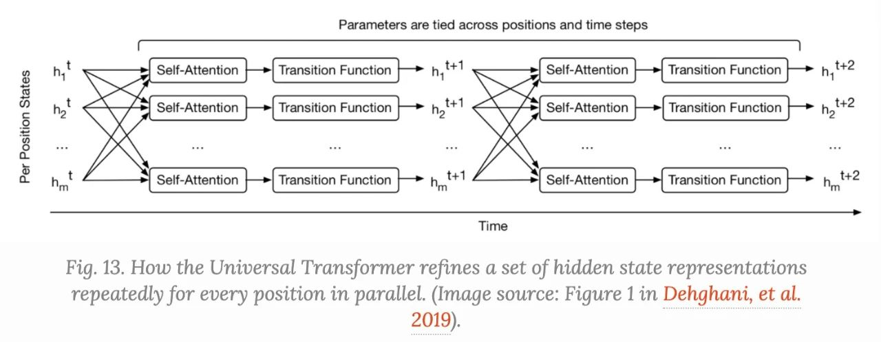 Universal Transformer使用自适应计算时间动态调整步长。如果我们固定步数,一个通用变换器就相当于一个多层变换器,具有跨层共享的参数。