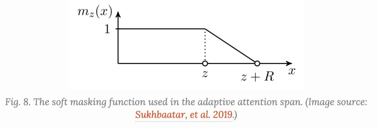 增加了一个soft mask函数 m_{z} 来控制有效的可调attention span,它将query和key之间的距离映射成一个 [0,1] 值。 m_{z}\in [0, s] 参数化, z 要学习: m_{z}(x) = clamp(\frac{1}{R}(R + z -x), 0,1)
