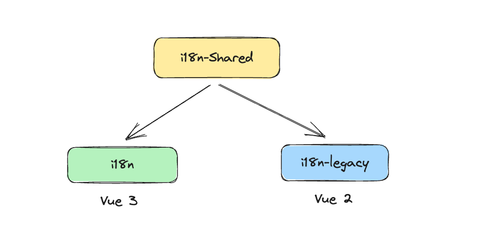 还有一个比较脑洞的例子,我之前封装过一个 Vue i18n 库,因为 Vue 2/3 差异有点大,所以我就拆了两个库来实现,如下图。