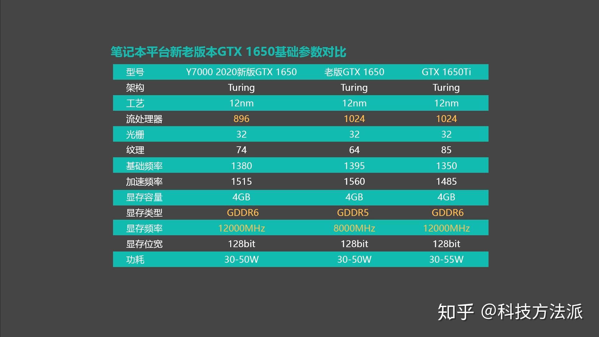 再来看显卡,2020年NVIDIA 也对游戏本平台的显卡产品线进行的调整,中高端的RTX系列增加了SUPER版,而入门、主流级GTX系列,老架构的GTX1050被移出家族,GTX 1650成为最入门级的一款游戏显卡,并在其上新增了一款GTX 1650Ti,从基础参数对比中可以看出,这款新的GTX 1650较老款更换了更好的GDDR6显存,但砍了部分流处理器。