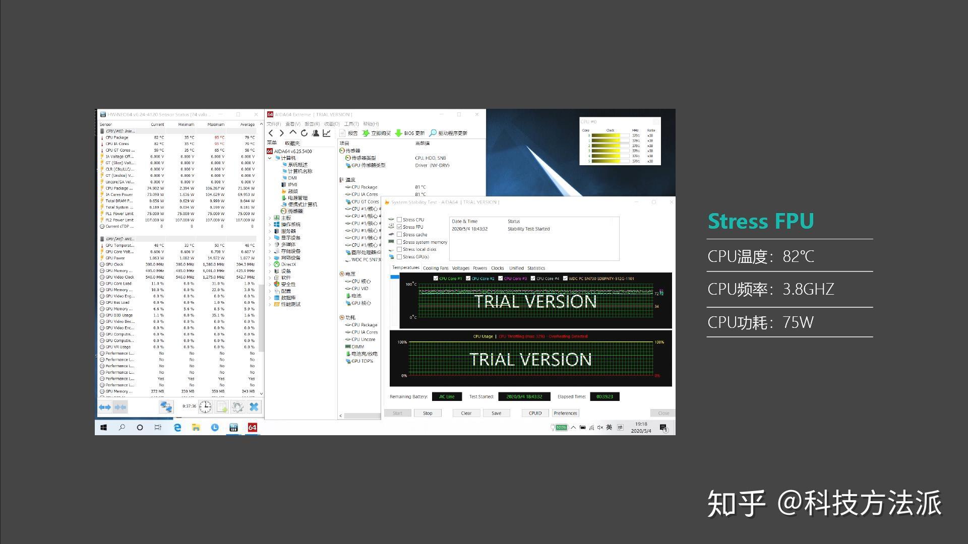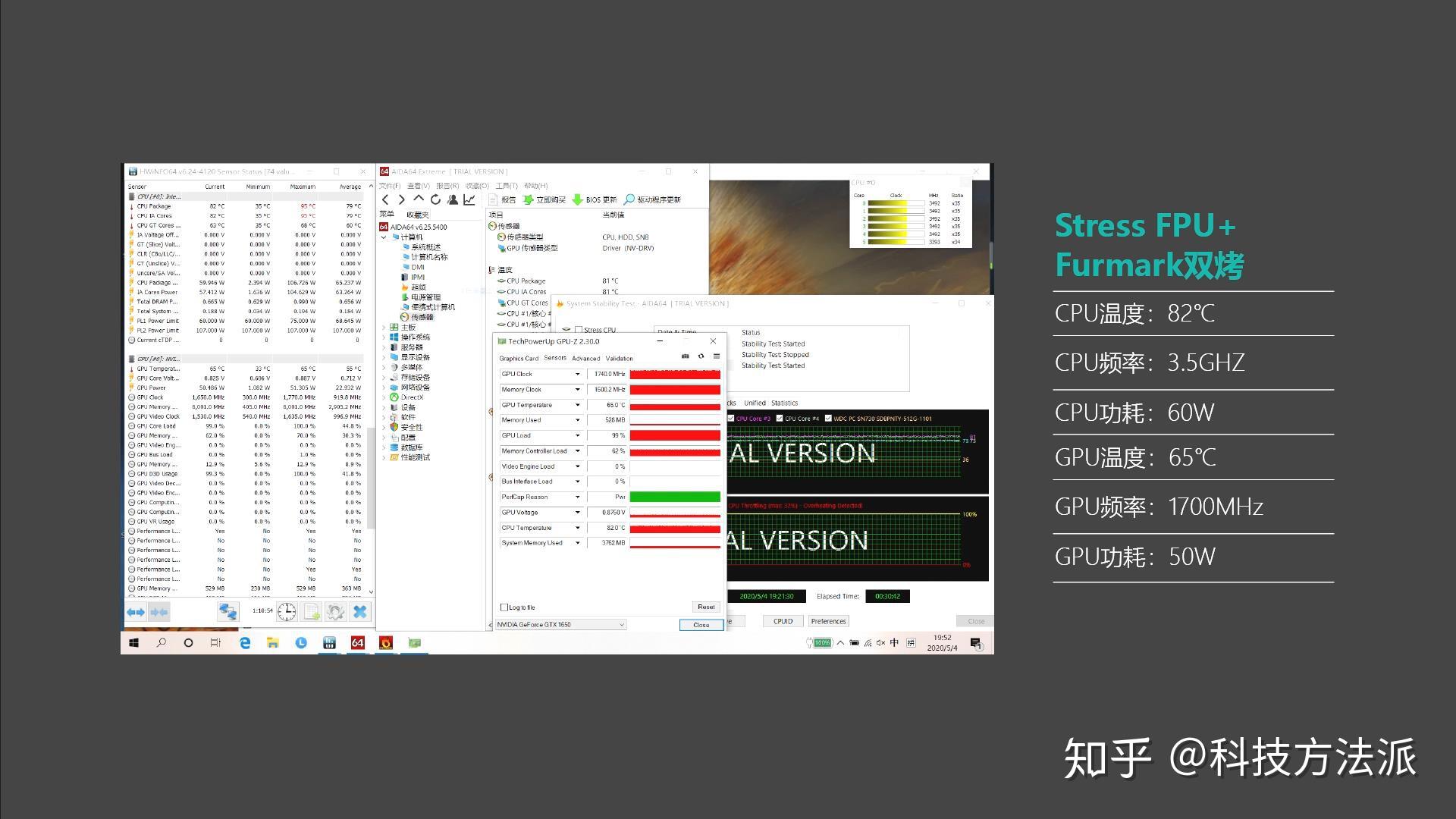 野兽模式下,在室温25℃左右,通过AIDA64单烤CPU半小时可以看出,CPU功耗75W左右,频率3.8GHz,温度82℃。在AIDA64和FURMAK双烤测试中,CPU功耗可以稳定在60W,频率稳定在3.5GHz,温度82℃,同时GPU功耗稳定50W,频率1700MHz左右,温度65℃。