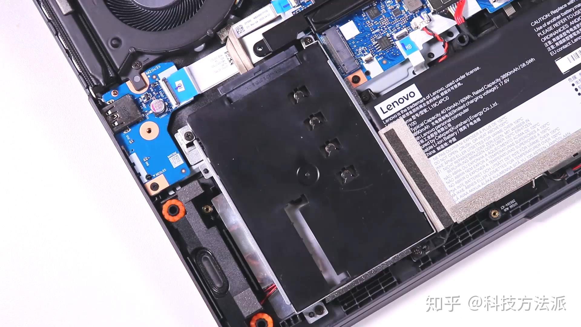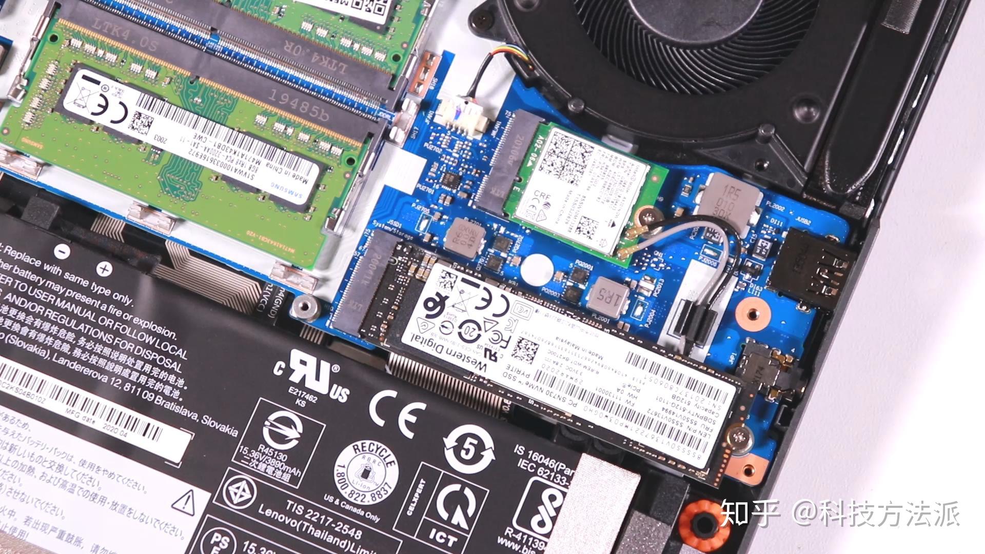 右侧固态硬盘和网卡的位置配有金属马甲,无线网卡为intel AX201,支持最新的wifi6和蓝牙5。我上手的这台Y7000 2020,512G固态硬盘为来自西数的SN730,NVME协议, PCIE3.0*4通道,读写速度都比较不错(Read 3422/Write 2716),在机身的另一侧,还留有第二个空闲的M.2固态硬盘插槽,以及机械硬盘位,不过有些遗憾的时,这两个硬盘位产生了重叠,也就是说无法同时安装,只能二选一。