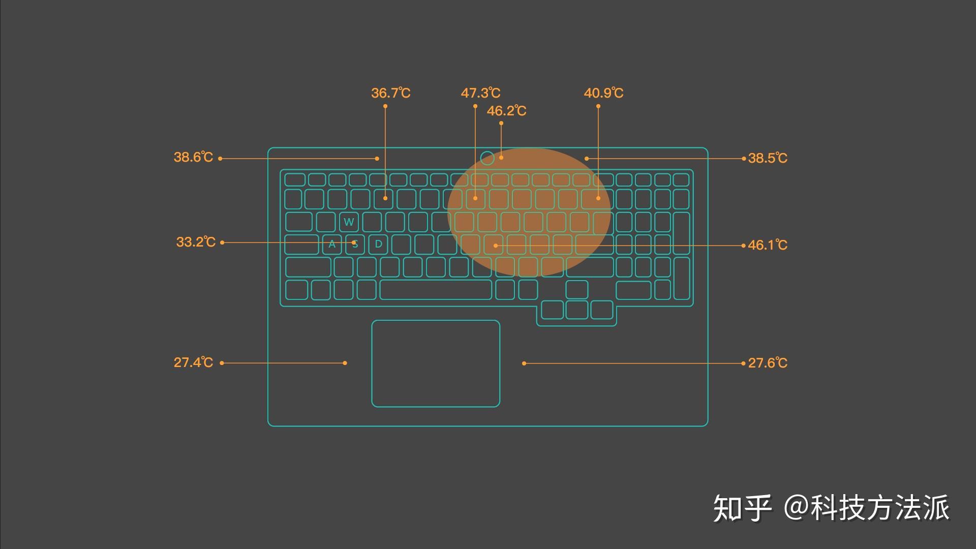 表面温度方面,高温区域在键盘偏右侧,最高47.3℃,WASD键处33.2℃, 腕托处27.5左右℃。噪音方面,野兽模式下,双烤满载时人位噪音最大49.5分贝左右。