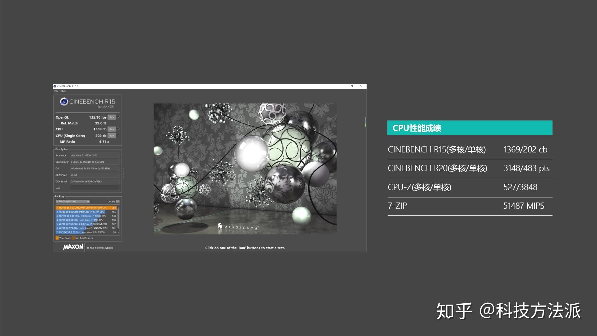 通过CINEBENCH R15的跑分可以看出,其多核跑分和单核跑分分别为1369分和202分,CINEBENCH R20的多核跑分和单核跑分分别为3148分和483分。单就这台笔记本来说,由于出色的性能释放,对比上代i7-9750H的平均分,多核性能有了15%~20%的提升。