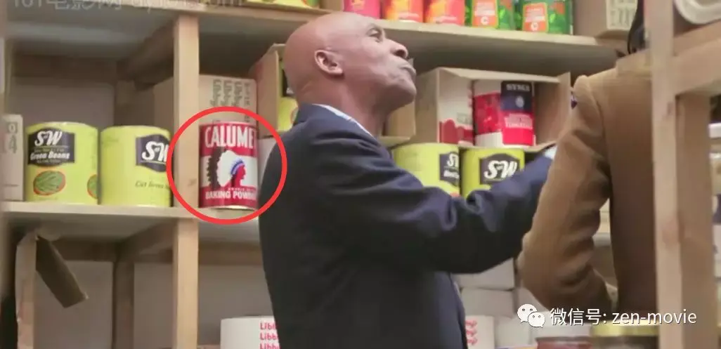 储物间两次在人物背后出现的, 印着印第安人头像 的罐头。