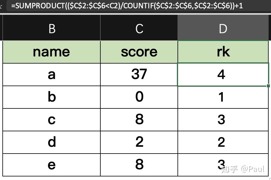 SUMPRODUCT(($C$2:$C$6<C2)/COUNTIF($C$2:$C$6,$C$2:$C$6))+1。