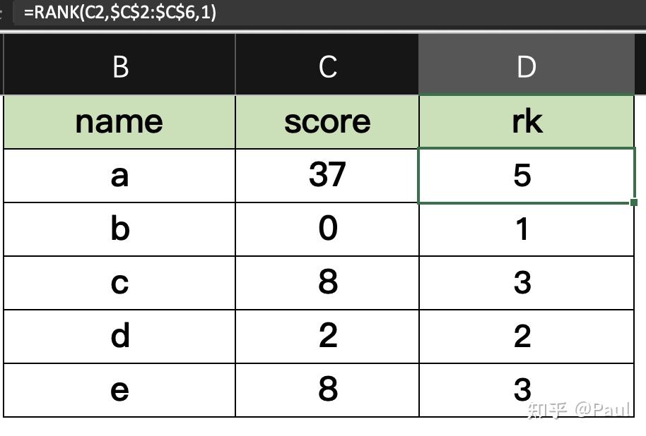 这里调用了 countif 函数,利用数据重复的条件,就比如上图,name为a、b、d所代表的行的数据都不是重复的,所以,他们的RANK(C2,$C$2:$C$6,1)+COUNTIF($C$2:C2,C2)-1就等价于RANK(C2,$C$2:$C$6,1)。