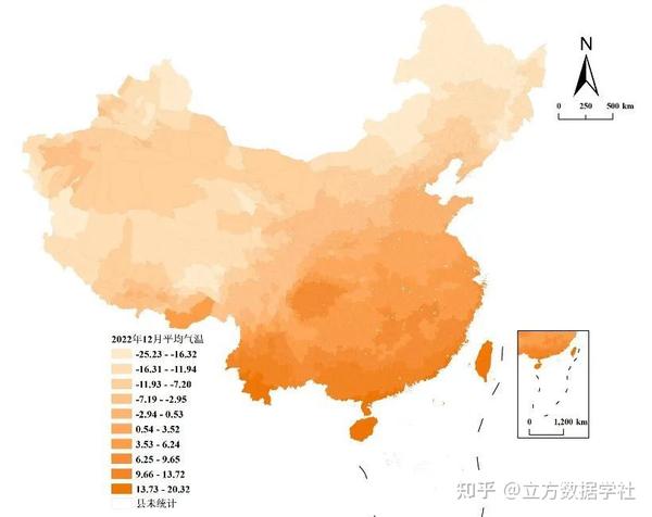 369个地级市的1950-2022年逐月的平均气温汇总在一个Shp文件中,下面我们以2022年12月为例来预览一下: