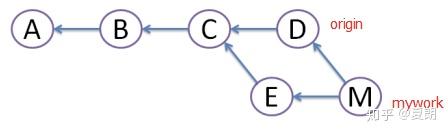 用git merge命令把"origin"分支与本地提交合并(merge)成版本M,mywork 分支中新的合并提交(merge-commit)将两个分支的历史连在了一起,但这样会形成图中的菱形,让人很困惑。