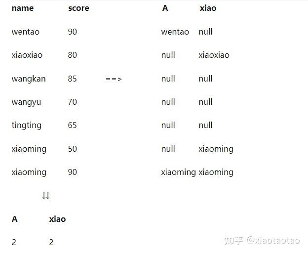 在上面的例子中,我们都是对score这个条件进行判断,不过在指标统计中,我们可以不同的条件进行不同的统计,比如我们要同时统计等级为A的人数和名字中带‘xiao’的人数,尽管这两个指标并没什么关系,这次我们增加一个重复名字的的student数据(xiaoming 90),这样就要使用count(distinct )来统计了。如下: