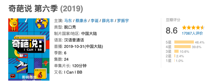 10月31日,《奇葩说》第六季开播,一改第五季的颓势,这一季将豆瓣评分拉到了8.6。