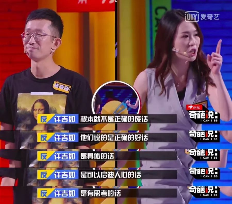 而更多人是认为许吉如的气势远远盖过了她辩论的内容,在第一期节目中,许吉如和杨奇函1V1辩论,三分钟的时间,观众可以感受到许吉如辩论语速之快用词之华丽,内容尚且浅显易懂。