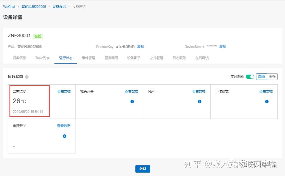 点击上图中设备右边的“ 查看 ”,然后进入下面的运行状态页面,可以看到我们上传的当前温度:26℃。