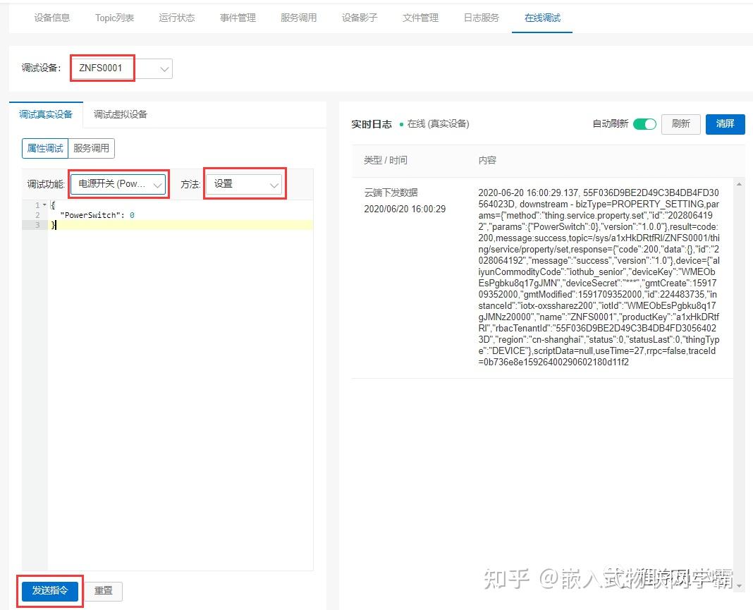 在“设备调试”页面,我们选择调试设备为“ZNFS0001”,然后选择一个调试功能,然后选择方法,然后点击发送指令,我们可以在实时日志中查看到下发数据的日志,说明下发数据成功。