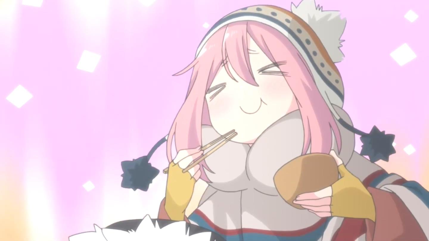 我们在某些日常系作品看过类似的事情,例如《摇曳露营》就常有吃饭途中,无缘无故特写抚子等人吃饭吃得超香的颜艺;《K-On》、《点兔》等等作品亦夹杂着大量类似的人物大特写。从商业的角度来讲,这种是为了卖萌的演出——也可能只是因为制作组想要省钱。