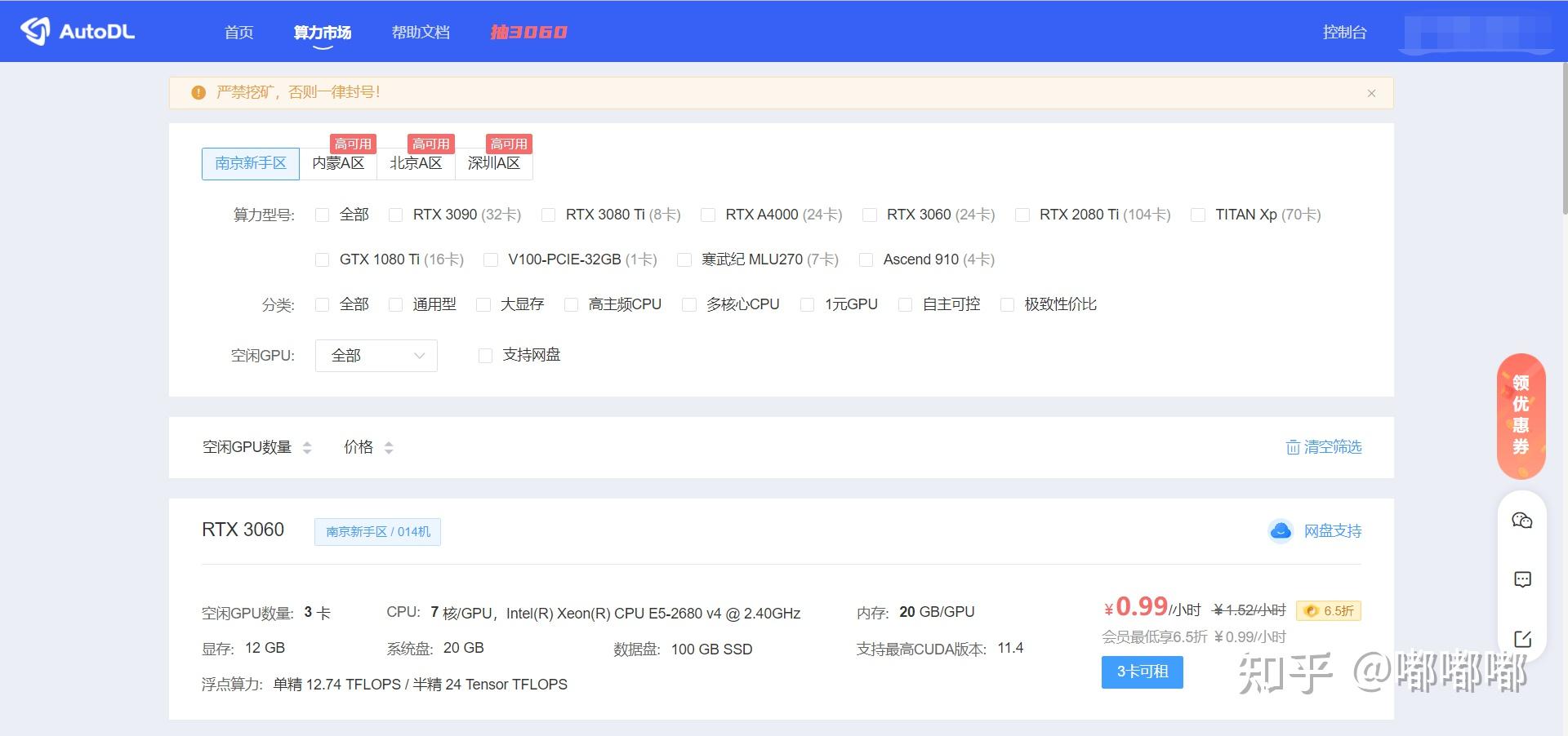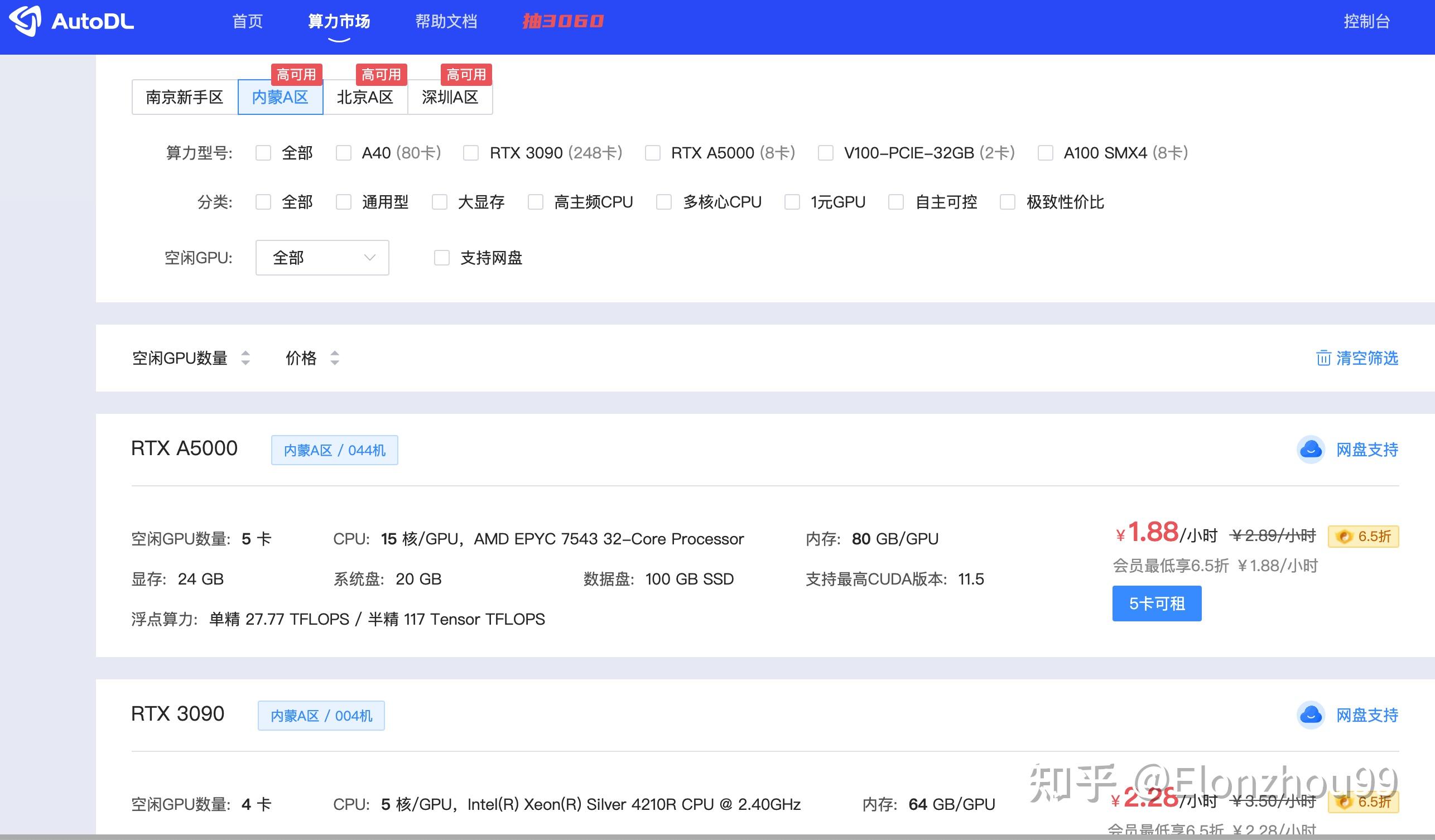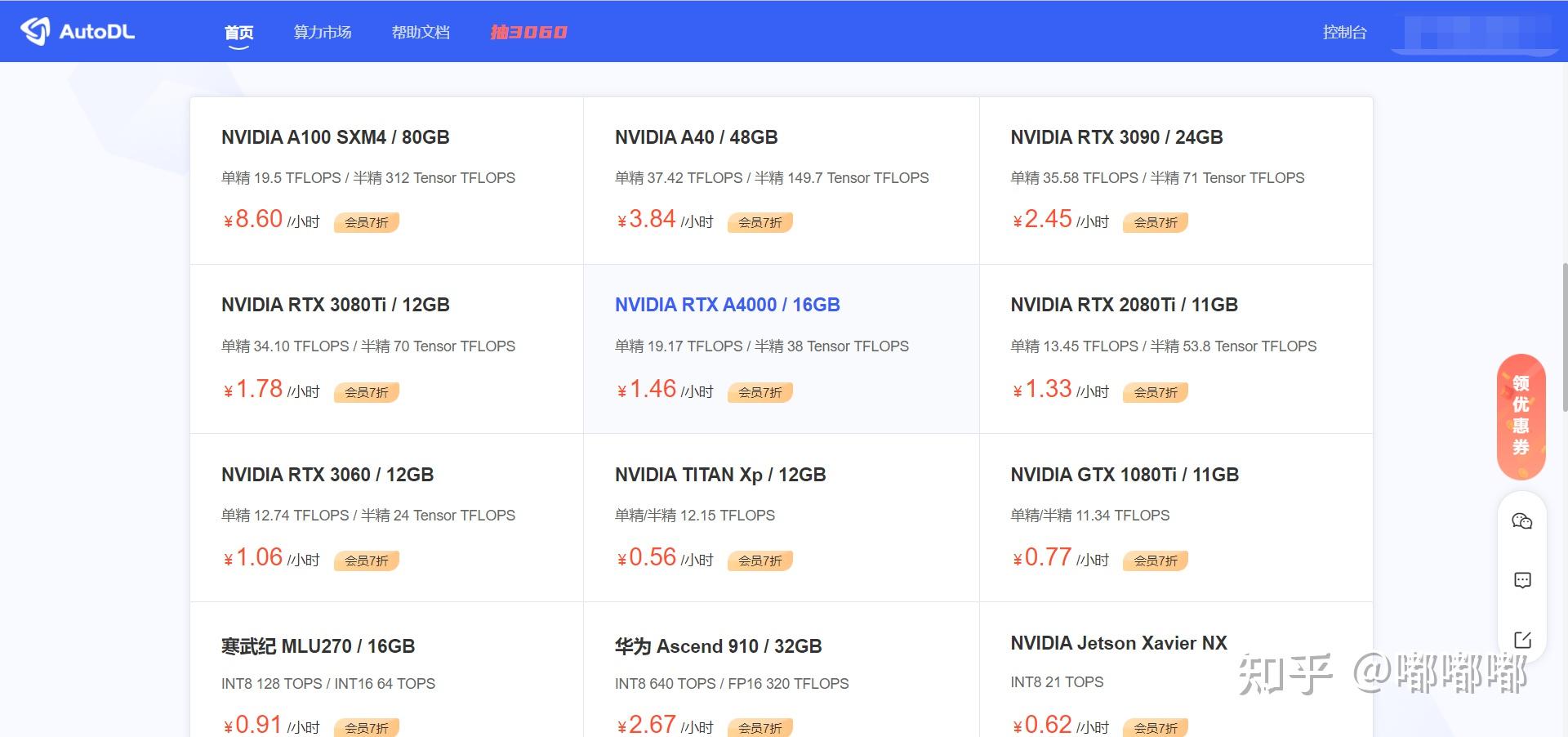 题主说了是学生党,那我们就要利用起学生这个身份,我对比过不少平台,不多比比直接推荐价格最便宜的:autodl,在学生价方面他们平台是最便宜的, 幼儿园级:xp 0.52/h,小学生级:3060 0.99/h,中学级3090 2.28/h 。自己也可以再去浏览其他平台对比下。对了这个平台还有优惠券,节日全场免费等活动。