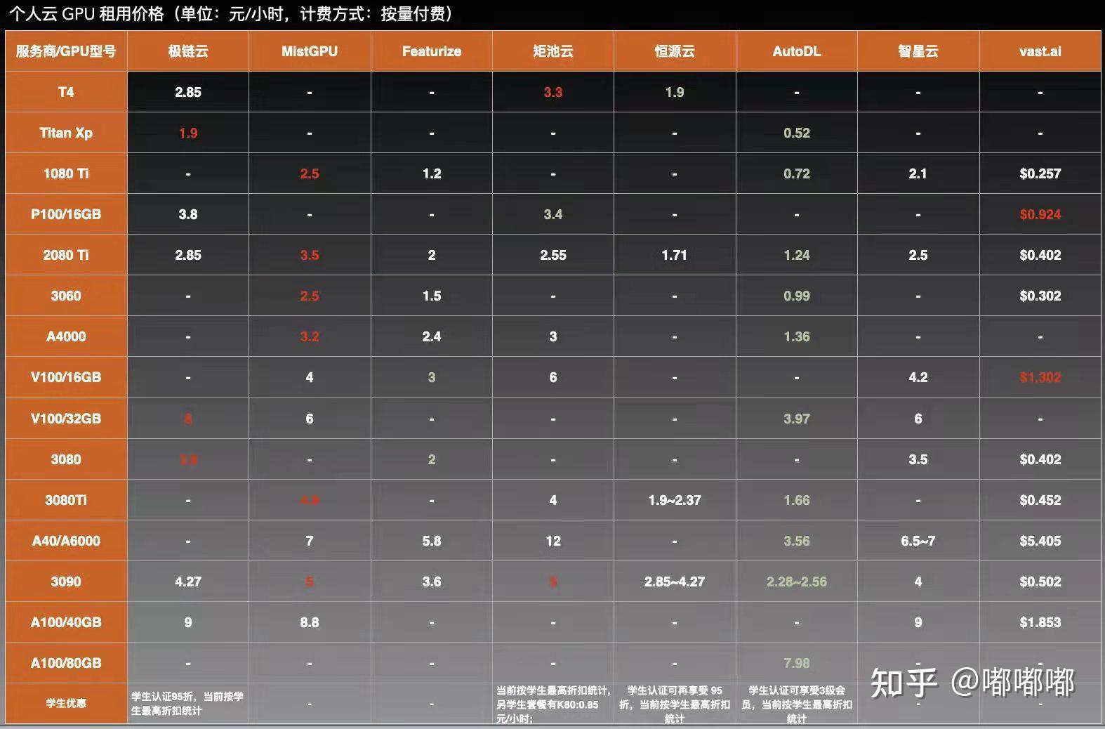 然后贴一下各种云平台针对学生租用gpu的价格对比