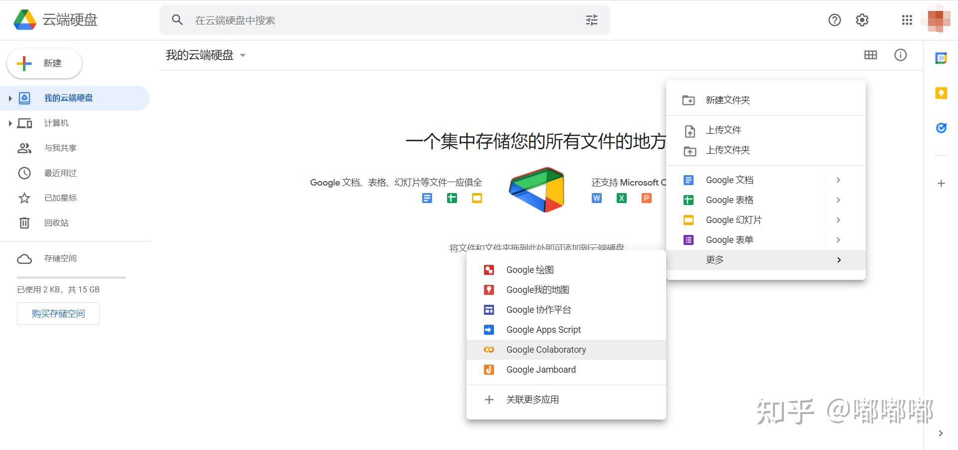 如果你刚刚接触深度学习,想从一些小的模型入手,那么Google Colab是首选,它会为你提供免费的gpu,并且平台环境都是配置好的,还有15个g的网盘空间供你使用。使用该平台需要先注册登录谷歌账号,然后打开谷歌云端硬盘。