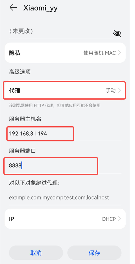 然后设置代理为“手动”,配置服务器主机IP和端口为Charles的代理,保存:
