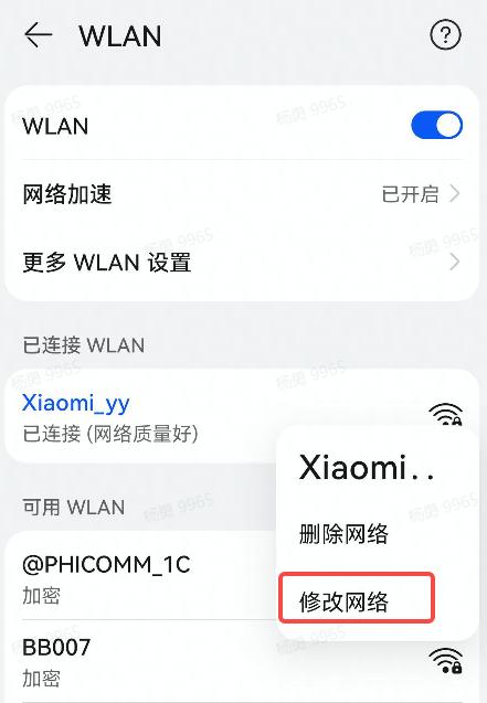 根据提示信息,先将手机配置为使用Charles的代理。进入手机设置》WiFi,在使用的WiFi上长按,选择修改网络: