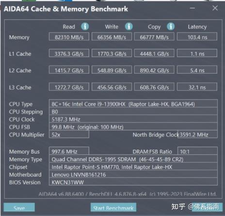 内存是来自海力士,为16GB(8*2)双通道DDR5,频率达到了5600MHz,频率很高。实测下来内存读取和写入速度确实非常高,尤其读取速度达到了82310MB/s。时延还算能接受,为103ns。