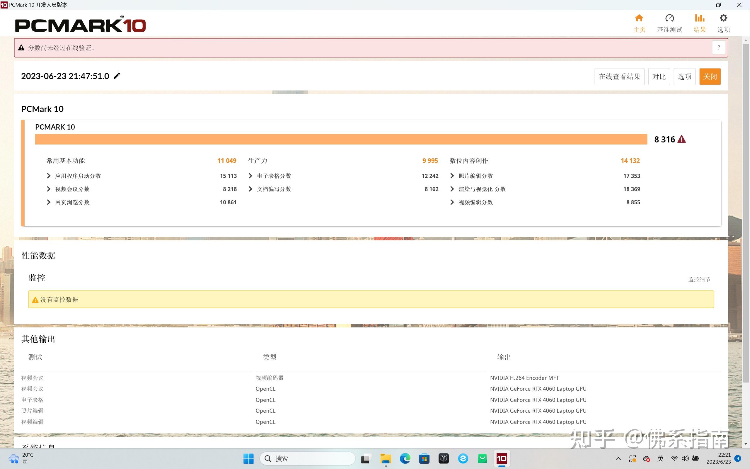 PCMark10得分达到了8316分,其中日常基本功能得分11049分,电子表格以及文档编写这种生产力得分9995,照片编辑、视频编辑这类的数位内容创作得分14132分,从PCMark10测试得分来看,高负载视频剪辑、PS处理都是没什么压力的。