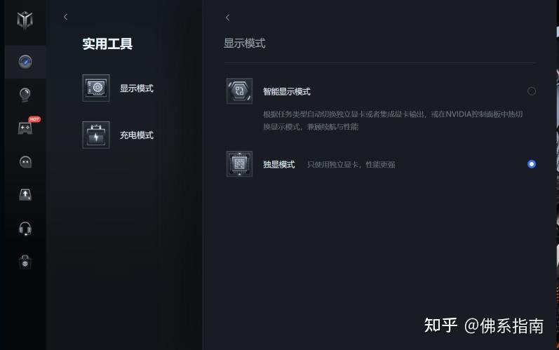 此外还可以再legion zone里面调节各种模式,比如显示模式、充电模式、屏幕超频等功能。(点击右上角工具箱icon开启,不再左侧大菜单栏里面)